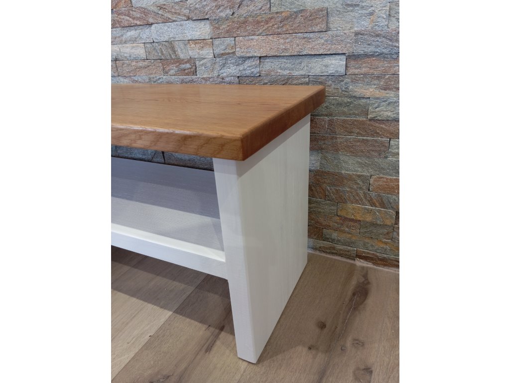 Lavička Florida je praktickým a stylovým kouskem nábytku do předsíně. Vrchní deska je vyrobena z masivu dub s olejem Osmo a nohy s policí z modřínu v bílé barvě, která dodá vašemu domovu útulný a harmonický vzhled.
