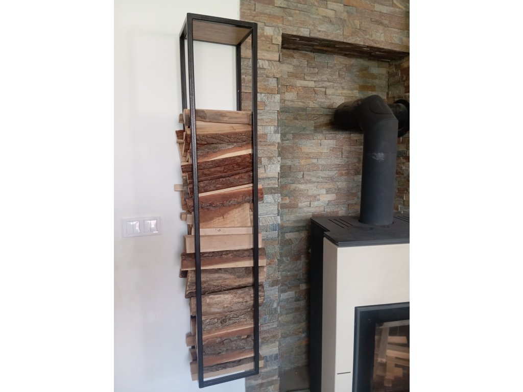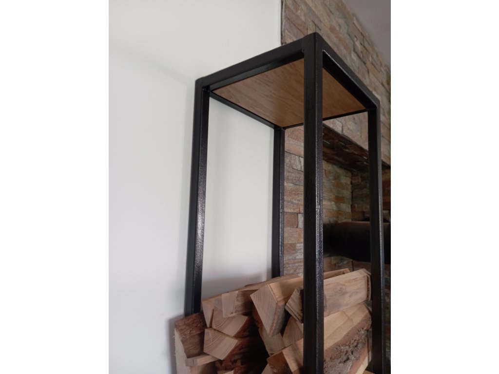Neobyčejný stojan na dřevo, který má konce vyplněny dubovým dřevem pro zpříjemnění atmosféry u krbu.